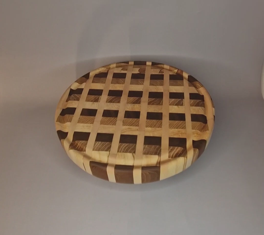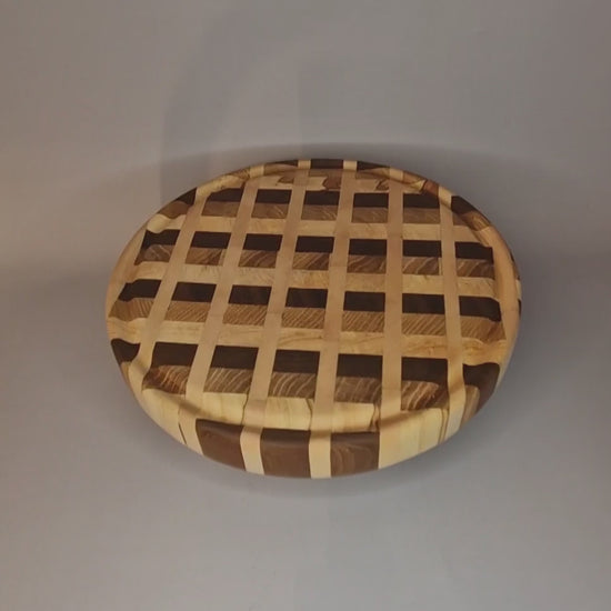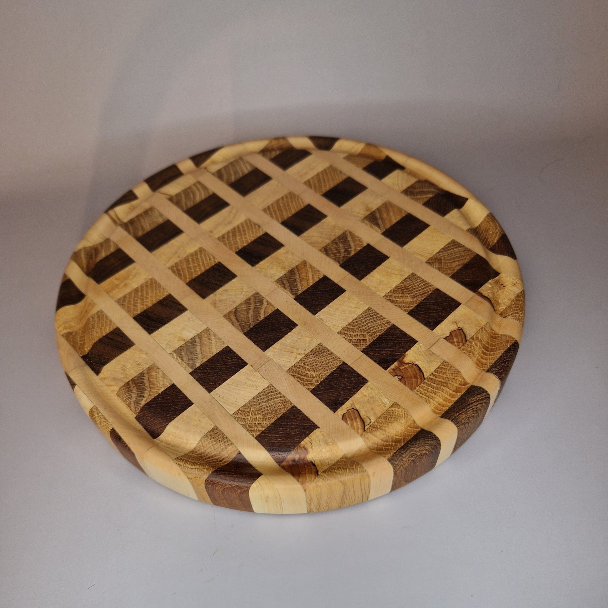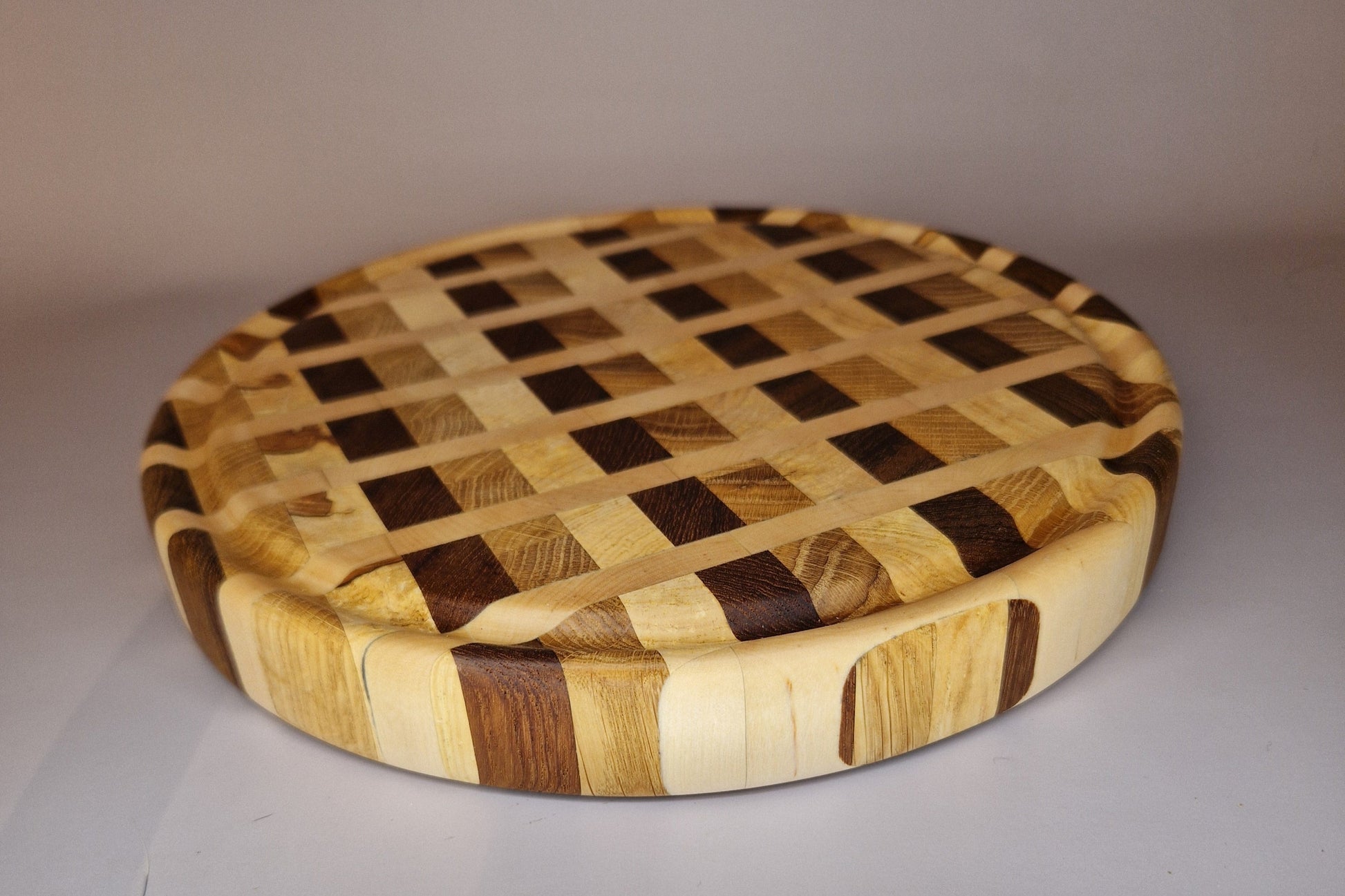 Lyxig och unik ändträ skärbräda/fat som är tillverkad av Björk, Ek och Mahogny i ett rut mönster. Den har ett försängt spår runt om för att samla upp vätska.
