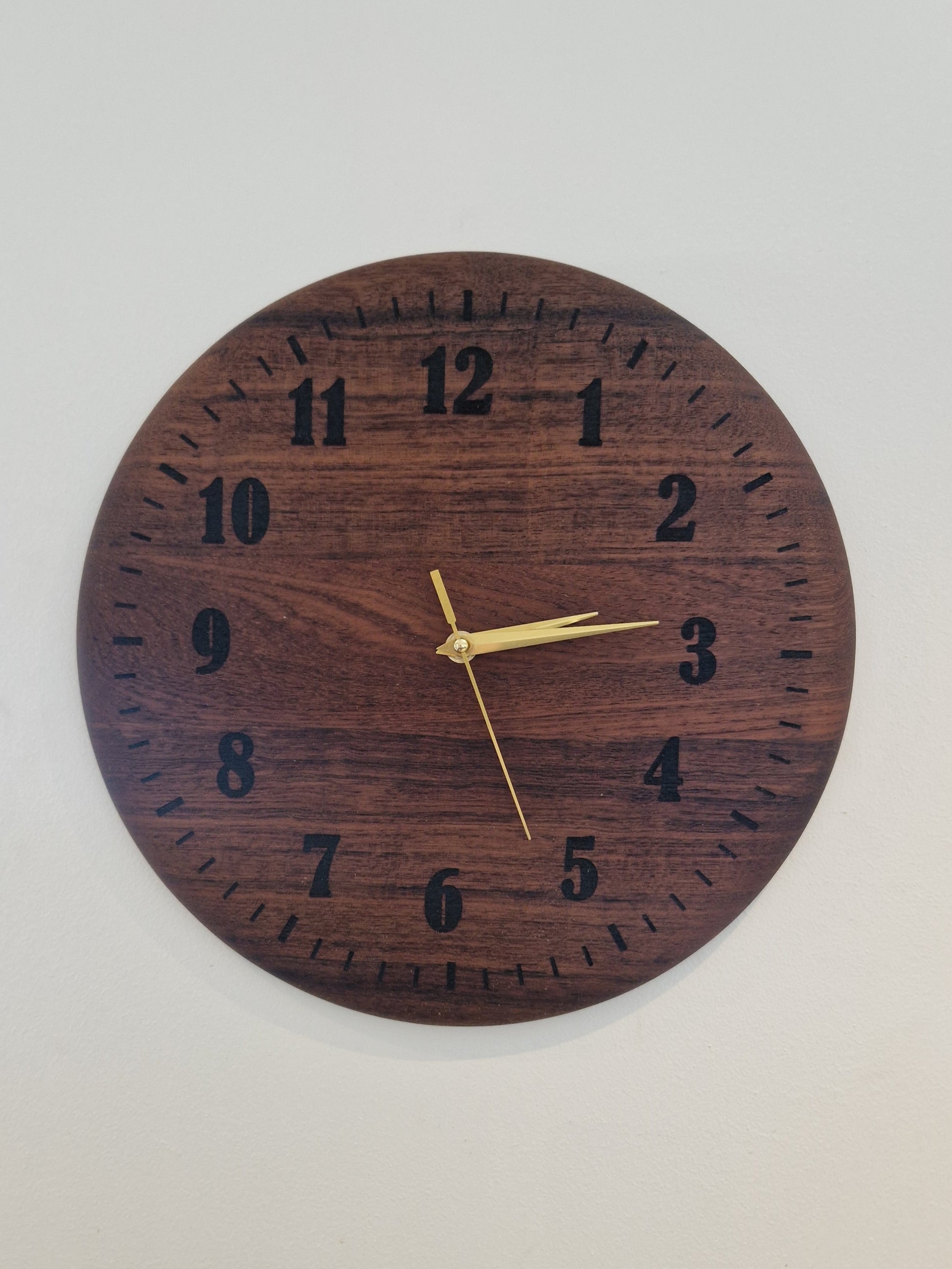 Svarvad och laser graverad väggklocka på 34 cm i diameter, den är tillverkad av återvunnen Mahogny.
